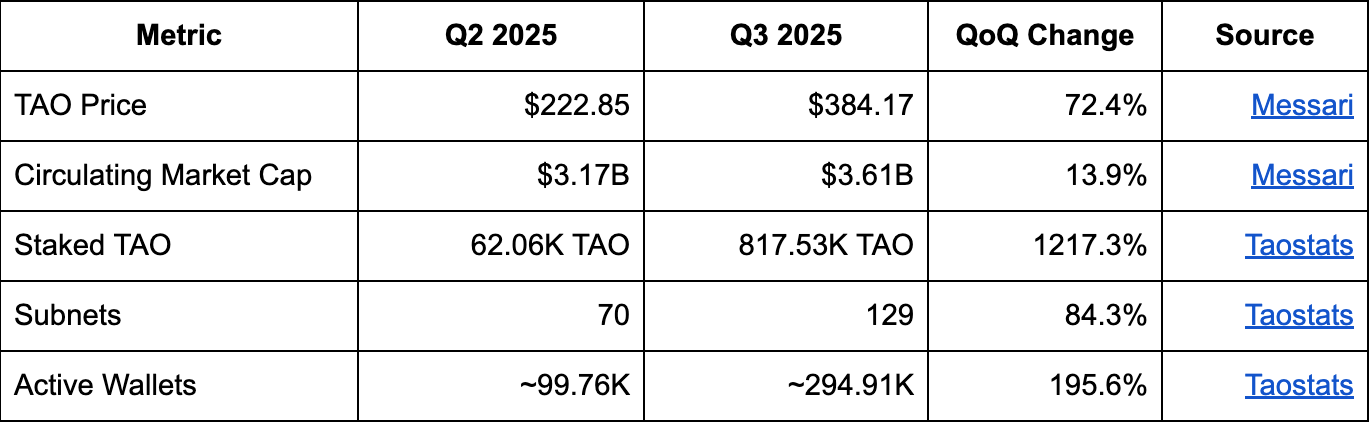 Subnets (Projects) more than doubled, 84.3% QoQ, and active wallets tripled, 195.6% QoQ, signaling rapid ecosystem growth and adoption across different subnets.